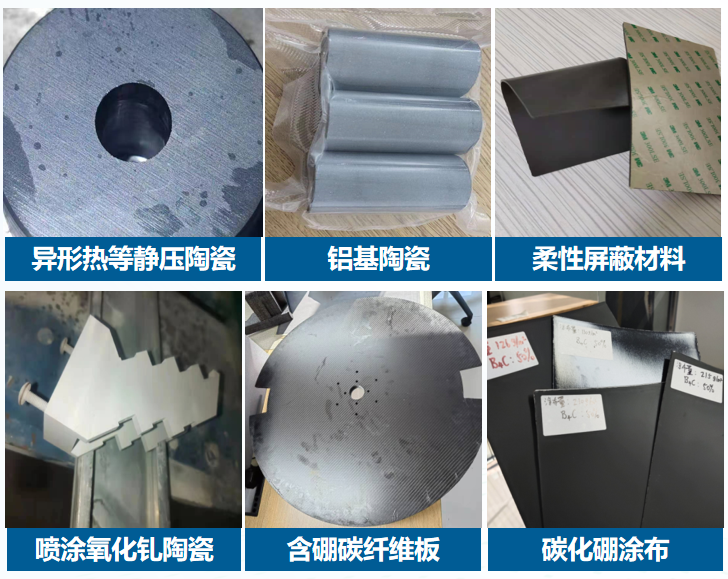 (1)先進輻射防護材料:公司從物理底層入手、采用材料基因組學等方法開發出完整的基礎元素材料數據庫,可在線開展屏蔽材料設計及優化,為用戶提供更小體積、輕量化的新型復合材料。讓新材料、新工藝研發進度更高效、周期更短、材料配方更精準、成本更低、更加輕量化。開發的產品包括:各種類型中子吸收材料(陶瓷、高分子、涂層、合金等)以及中子慢化材料(各種配方的復合陶瓷與高分子材料)等,部分產品如下圖;