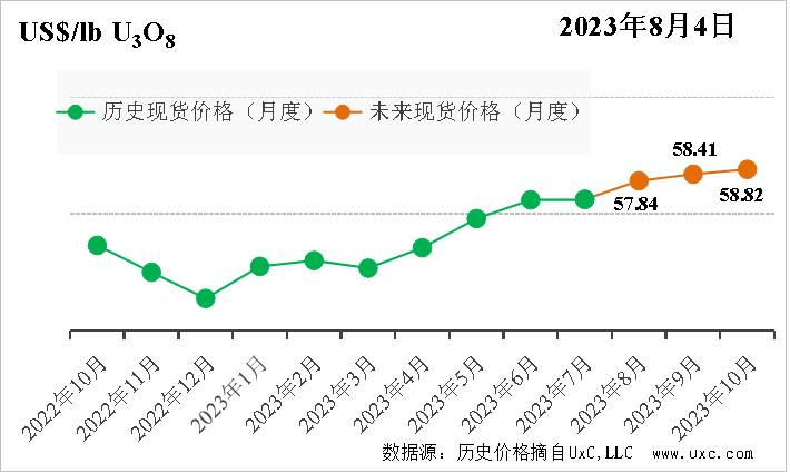 2023年8月10日,中國核能行業協會發布第33期“CNEA國際天然鈾價格預測指數(2023年8月)”。