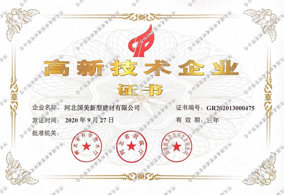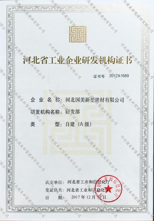 河北國美新型建材有限公司不斷壯大的同時,在科學發展方面取得了豐碩的成果。共開展研發項目28項,其中授權發明專利2項,實用新型專利18項。被認定為“高新技術企業”“保溫材料研究院”“河北省企業技術中心”“河北省專精特新示范企業”“河北省專精特新中小企業”“行業先進單位”。作為“中國絕熱節能材料協會”常務理事單位。“中國鋼結構協會、中國耐火材料協會、中國硅酸鹽協會耐火材料分會、中國聲學學會”會員單位,參與了多項國家標準、團體標準的制定、修訂工作。