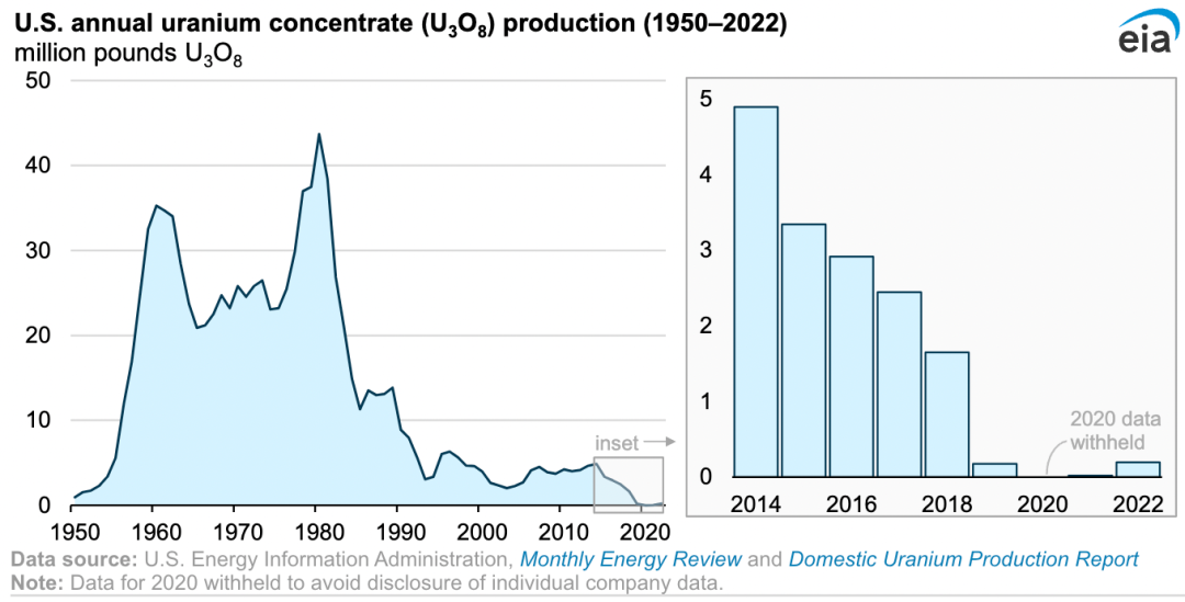 2022年,美國的鈾精礦(U3O8)產量比前一年高出近10倍,部分原因是受到鈾價格上漲激勵,但美國的U3O8產量仍接近歷史低點。