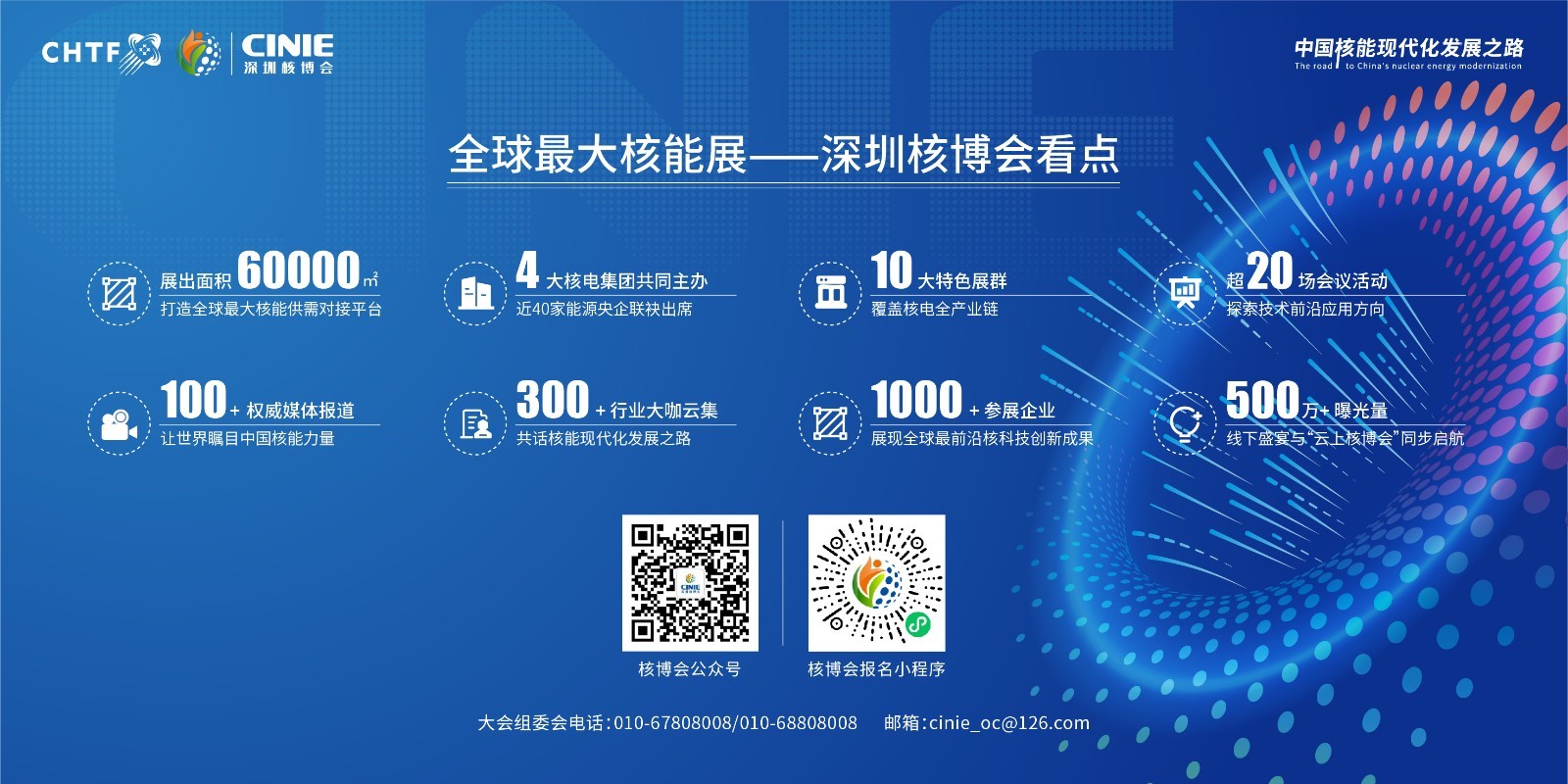 中國核能高質量發展大會暨深圳國際核能產業創新博覽會(簡稱“深圳核博會”)將于11月15-18日在深圳國際會展中心舉辦。大會由中國能源研究會、中國廣核集團有限公司、深圳市發展和改革委員會共同主辦,中核集團、中國華能、中國大唐、國家電投、國家能源集團聯合主辦,主題為“核聚灣區·能動世界”。