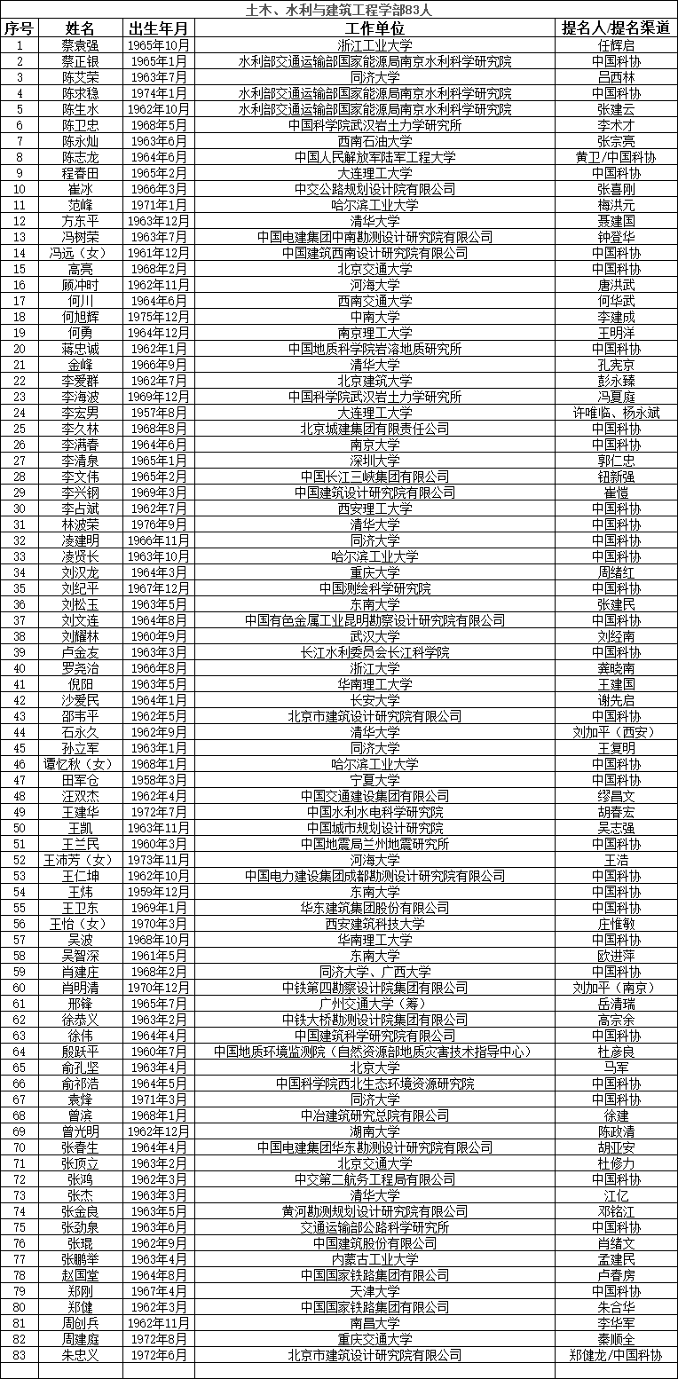 中國工程院2023年院士增選提名工作已經結束。經中國工程院第八屆主席團第六次會議審議,中國工程院黨組審定,確認中國工程院2023年院士增選有效候選人655人。根據《中國工程院院士增選工作實施辦法》的規定,現將有效候選人名單予以公布。