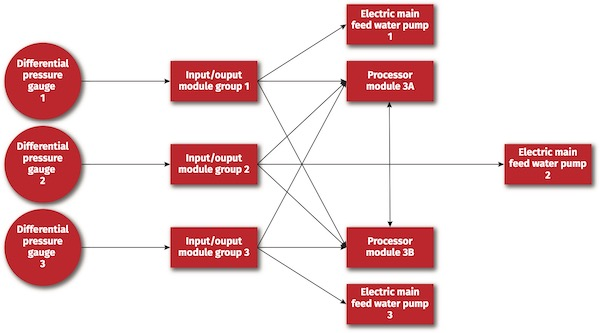 核發(fā)電機組的給水系統(tǒng)為每臺機組配備了三臺電動給水泵,給水母管和蒸汽母管之間的實際壓降由三個差壓計測量。