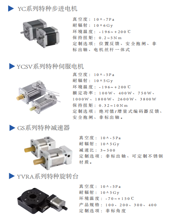 公司專業解決極端環境的特種電機(步進和伺服),主要使用環境有:耐輻射10^6Gry、真空1.0*10^-7pa、深低溫-196℃、高溫+200℃;同時可擴展抗沖擊、耐鹽霧、抗霉菌等性能特性。