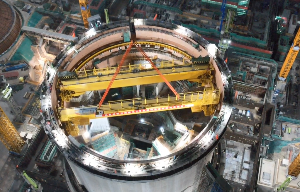 在三澳基地大團隊的協同配合下,中核二三公司三澳項目部全體職工咬定目標、主動謀劃、嚴格過程管控,充分吸收以往環吊施工經驗和良好實踐,優化施工邏輯和核心施工工序,采用先進工裝,堅持精益創效,強化黨建引領等措施,以開工即決戰的心態,克服了組裝工作量大、工期緊張、地面組裝場地狹小、建安深度交叉作業等多重困難,最終于FCD+21實現環吊吊裝工作。