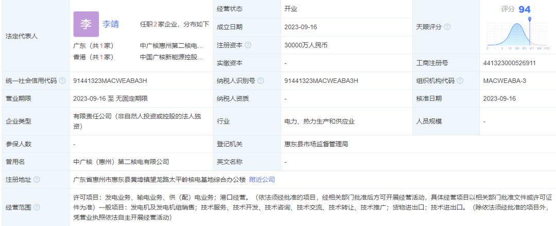 據(jù)天眼查App顯示,9月16日,中廣核惠州第二核電有限公司成立,法定代表人為李靖,注冊(cè)資本3億元人民幣,經(jīng)營(yíng)范圍含發(fā)電業(yè)務(wù)、輸電業(yè)務(wù)、供(配)電業(yè)務(wù)、港口經(jīng)營(yíng)、發(fā)電機(jī)及發(fā)電機(jī)組銷(xiāo)售等。該公司由中國(guó)廣核集團(tuán)有限公司全資持股。