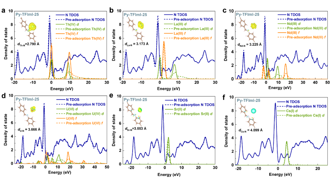 本研究中設計合成的兩種共價有機框架材料在六價鈾、二價鍶、一價銫、三價鑭、三價鐠、三價釹、三價釤、三價銪和三價釓等競爭性離子存在的10元素介質下,均對四價釷表現出高達102-105的分離因子,優于現有文獻報道中的大多數吸附劑。與此同時,團隊進一步開展研究,通過態密度圖和差分電荷分析,發現釷離子和鑭系離子之間的分離原因,是由于錒系元素的5f和6d軌道間的能量差小于鑭系元素4f和5d軌道之間的能量差所致。吸附過程中,水合釷離子中的一個配位水分子被共價有機框架結構中的氮原子取代,形成釷-氮配位鍵。不同氮位點對釷的親和力不同,中性非離子型共價有機框架材料比多種離子型共價有機框架材料的釷離子捕獲能力和速率更為顯著,證明了苯并咪唑氮位點是吸附性能提高的根本原因。