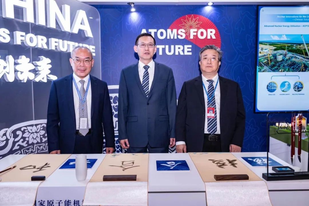 9月25日,余劍鋒和中國代表團團長、國家原子能機構副主任劉敬,中國常駐維也納聯合國和其他國際組織代表、特命全權大使李松等來到中國展臺,詳細了解高溫氣冷堆、玲龍一號等核能創新解決方案及綜合利用情況,并在參觀后執筆分別寫下“合”“和”“核”三個字。國際原子能機構副總干事劉華、約旦原子能委員會主席圖甘、阿根廷原子能委員會主席阿德里安娜等也參觀了中國展臺。