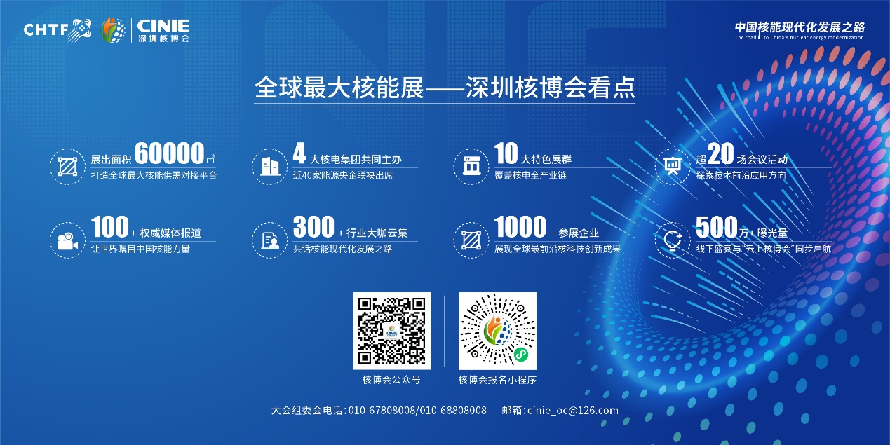 中國核能高質量發(fā)展大會暨深圳國際核能產業(yè)創(chuàng)新博覽會(簡稱“深圳核博會”)將于11月15-18日在深圳國際會展中心舉辦。大會由中國能源研究會、中國廣核集團有限公司、深圳市發(fā)展和改革委員會共同主辦,中核集團、中國華能、中國大唐、國家電投、國家能源集團聯合主辦,主題為“核聚灣區(qū)·能動世界”。