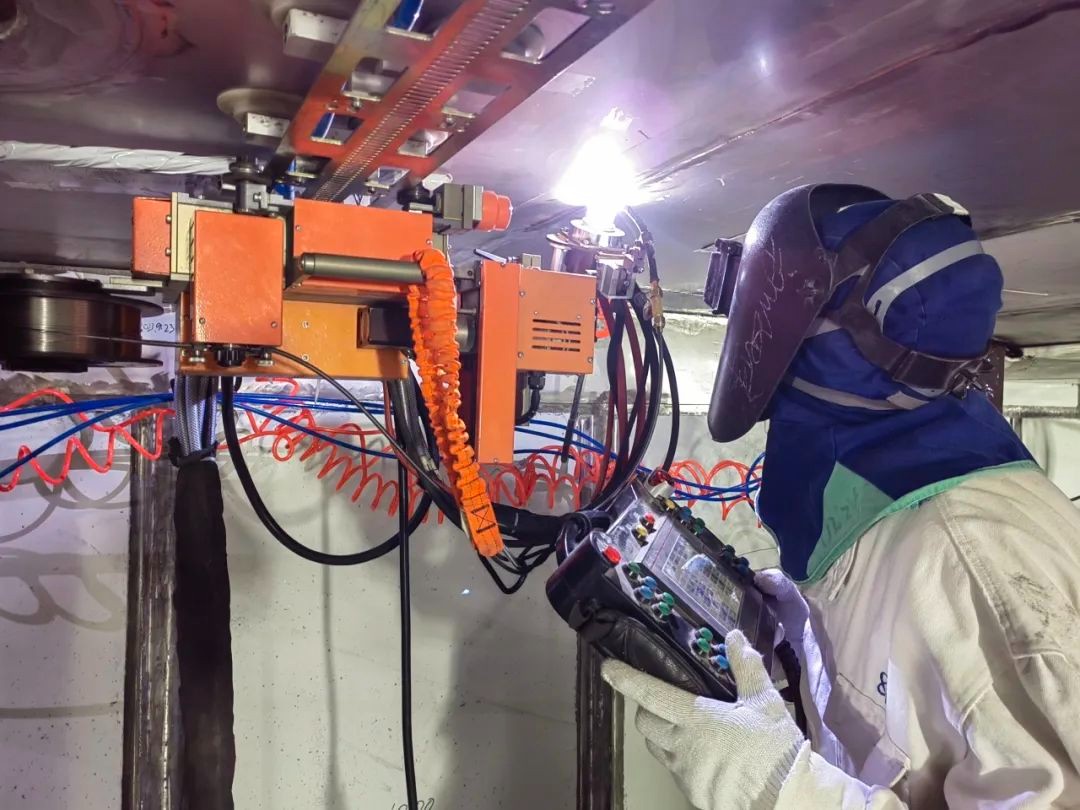 雙鎢極熱絲TIG焊是雙鎢極+熱絲高效TIG自動焊設備,通過對氬弧焊雙電源協同控制算法的研發,實現兩支獨立鎢極電弧的耦合輸出。該技術集合雙鎢極電弧控制技術和TIG熱絲系統,全面提高TIG焊的熔覆效率,突破傳統TIG焊焊接效率瓶頸,焊接效率較手工TIG焊提高4倍以上,首批焊接6臺設備同時進行,2小時完成焊縫36m,全部100%合格,實現了高質量、高效率的焊接目標。