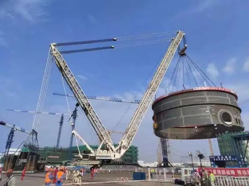 2023年10月13日9時16分,中核機械工程3200t履帶吊經過了起吊、回轉、行走、落鉤和就位一系列動作,圓滿完成海陽核電4號機組鋼制安全殼一環(以下簡稱CV一環)吊裝工作。