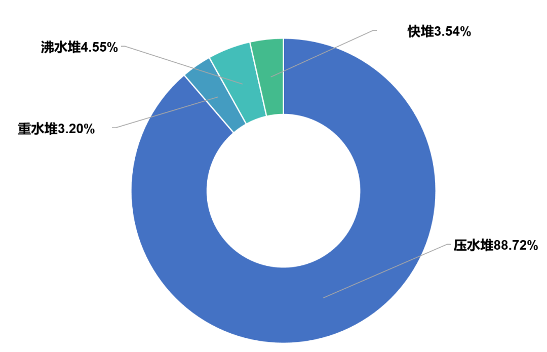 世界32國在運411臺核電中,壓水堆301臺,裝機容量289.1GW,占比77.92%;重水堆46臺,裝機容量24.1GW,占比11.19%;沸水堆42臺,裝機容量44.1GW,占比11.89%;輕水冷卻石墨慢化堆11臺,裝機容量7.4GW,占比1.99%;快堆2臺,裝機容量1.4GW,占比0.38%;氣冷堆8臺,裝機容量4.7GW,占比1.27%;高溫氣冷堆1臺,裝機容量0.2GW,占比0.24%。