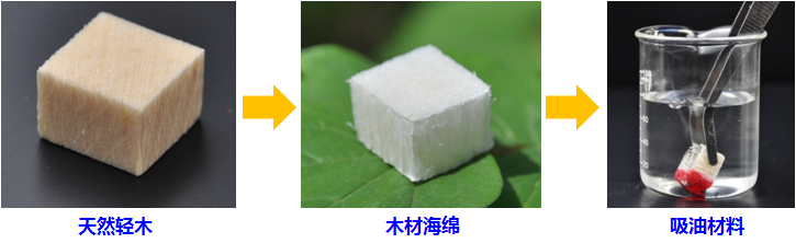 木材海綿材料密度低(約0.03 g/cm3)、孔隙度高(約98%)、壓縮彈性好(經(jīng)100次循環(huán)壓縮,回復(fù)率保持90%以上);木材海綿經(jīng)過(guò)疏水處理可作為一種可重復(fù)使用的吸油材料,用于水中油污染處理,其吸油性能達(dá)16~41g/g,且可通過(guò)機(jī)械擠壓的方式排油。