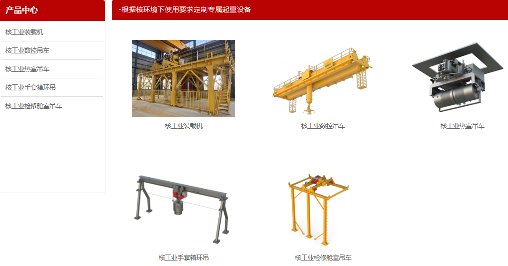 公司產品面向特殊環境物料搬運領域,參與過中核四 0 四、中核第二研究院、中國原子能院、中核第四研究院、中國核電工程公司等多項核工業相關項目。有足夠的經驗和專業知識,足以對任何起升設備和各種形式吊車系統提供咨詢、設計、制造、安裝和運行維護服務。