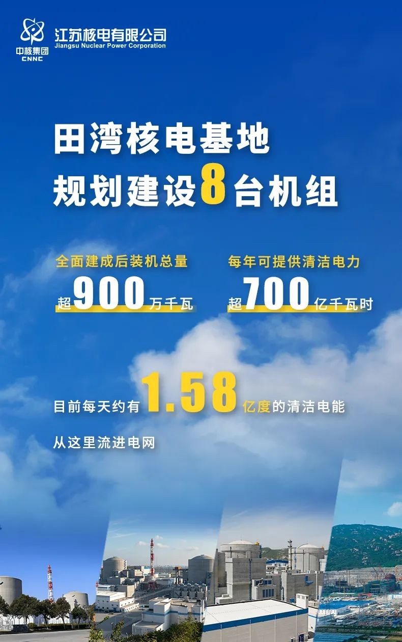中核集團(tuán)田灣核電基地位于江蘇省連云港市連云區(qū),規(guī)劃建設(shè)8臺(tái)機(jī)組,全面建成后裝機(jī)總量超900萬(wàn)千瓦,每年可提供清潔電力超700億千瓦時(shí)。目前田灣核電站1-6號(hào)機(jī)組在運(yùn),每天約有1.58億度的清潔電能從這里流進(jìn)電網(wǎng);7、8號(hào)機(jī)組在建,田灣核電7號(hào)機(jī)組安裝工作全面啟動(dòng),凝汽器即將開始安裝,8號(hào)機(jī)組處于土建高峰并順利推進(jìn),兩臺(tái)機(jī)組預(yù)計(jì)分別于2026年、2027年投運(yùn)。