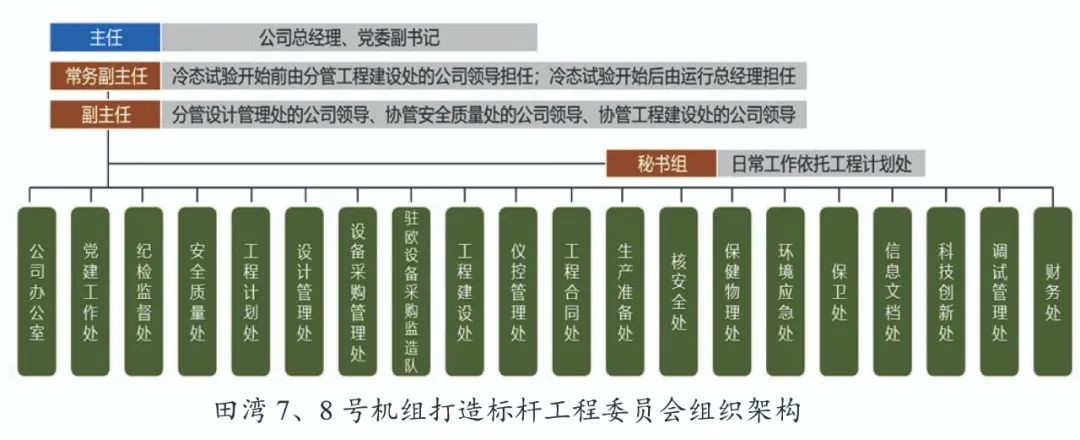 2021年12月,江蘇核電成立田灣7、8號機組打造標桿工程委員會,由公司總經理擔任主任,并設置秘書組,負責全面領導打造標桿工程各項工作,對指標體系、評價辦法和管理制度的構建實施進行全過程審核把關,打破傳統管理組織形式的壁壘,從而確保田灣7、8號機組打造標桿工程的順利實施。
