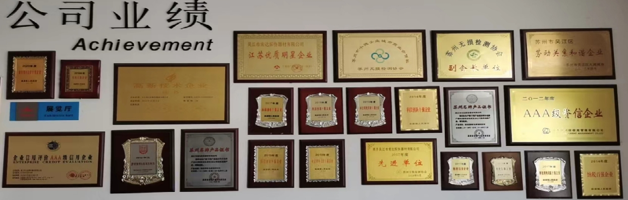 吳江市宏達探傷器材有限公司是一家生產(chǎn)無損檢測器材的高新技術企業(yè),全國無損檢測標準化技術委員會會員企業(yè),蘇州市企業(yè)技術中心,蘇州市名牌企業(yè)。并通過國家方圓認證中心審核,獲GB/T19001:2015/ISO9001:2015國際質(zhì)量體系認證、GB/T24001-2015/ISO14001:2015環(huán)境管理體系認證、GB/T45001-2018/ISO45001:2018職業(yè)健康全管理體系認證并獲國際認證聯(lián)盟IQNet、ISO9001:2015、ISO45001:2018、ISO14001:2015的認證;通過興原認證中心審核,取得《中國核電產(chǎn)品合格供應商》認證。《江蘇省高新技術企業(yè)》;《江蘇省民營科技企業(yè)》;《蘇州市名牌產(chǎn)品》;蘇州市政府認定《企業(yè)技術中心》、《企業(yè)工程中心》;《江蘇省優(yōu)質(zhì)明星企業(yè)》。2006年被中國產(chǎn)品質(zhì)量管理中心認定為《國家標準合格 質(zhì)量放心品牌》;2008年獲得《江蘇省名牌產(chǎn)品》和《中國名優(yōu)產(chǎn)品》,2009年獲得《全國質(zhì)量信譽.AAA企業(yè)》,2013年獲《江蘇省優(yōu)質(zhì)環(huán)保產(chǎn)品》、《江蘇省質(zhì)量管理先進單位》、《江蘇省優(yōu)質(zhì)明星企業(yè)》。2019年第十六屆中國科學家論壇;《2019中國科技創(chuàng)新先進單位》《2019中國科技創(chuàng)新優(yōu)秀發(fā)明成果獎》;2020年第四屆中國品牌大會《中國科技創(chuàng)新品牌》;2020年獲《江蘇省質(zhì)量服務誠信五星級企業(yè)》;努力進取、不斷創(chuàng)新,為廣大用戶提供技術先進的探傷器材。