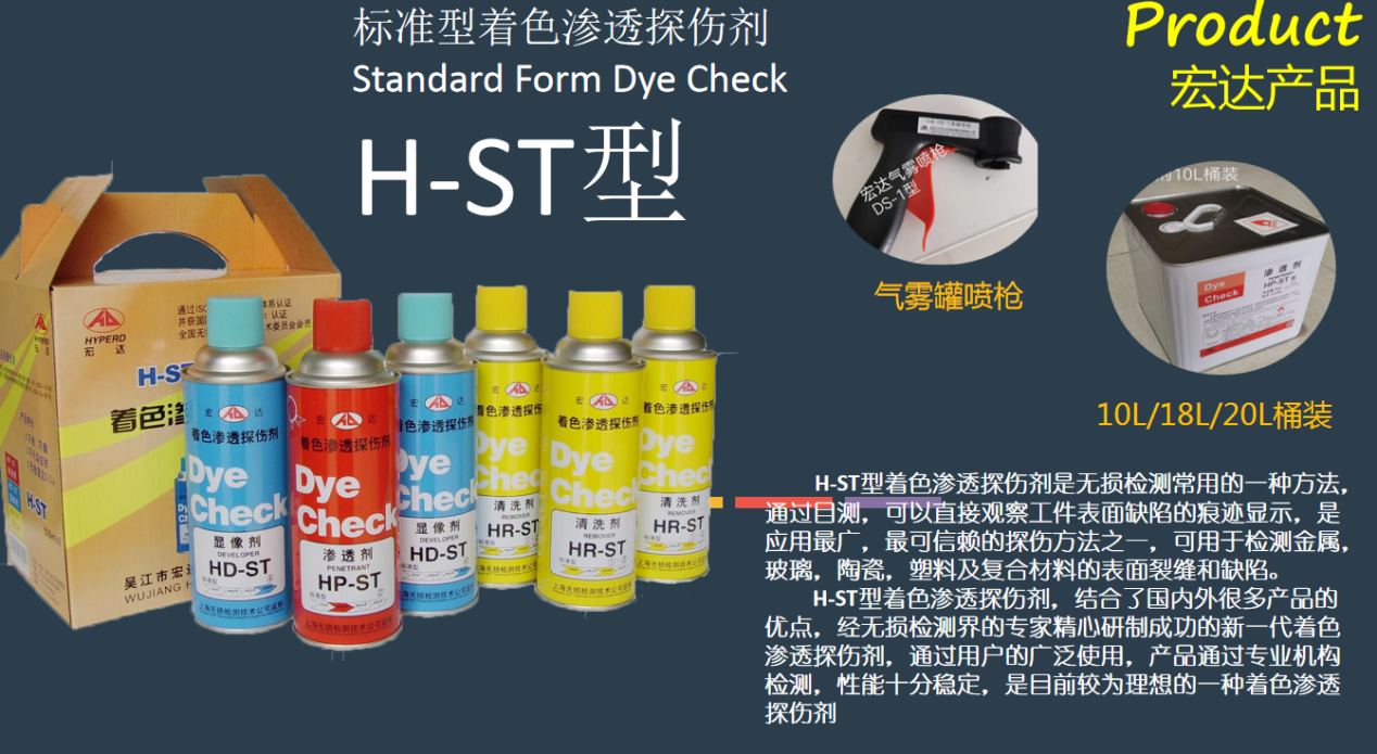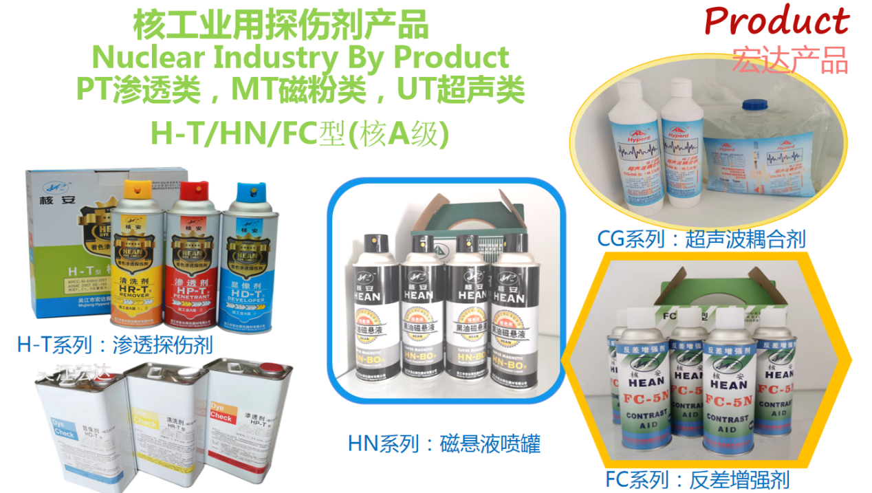 公司主要生產(chǎn)的H-ST(標準型)著色滲透探傷劑、H-T核級著色滲透探傷劑、滲透標準試塊;FC-5型反差增強劑(核級)、HD系列磁懸液噴罐(核級)及磁粉、標準試片、CG系列超聲波耦合劑(核級)、GW系列高溫耦合劑、超聲波試塊;磁粉探傷儀、UL系列紫外線探傷燈、紫外線照度計、恒溫洗片機、自動干片機、烘干箱、NR-3L(6L)型冷熱光源觀片燈、膠片印字機、JD-210A型黑白密度計、DV-8AB型標準密度片、增感屏、暗袋等器材。