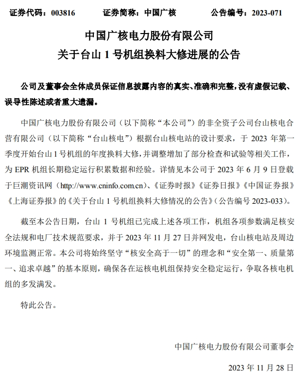 截至本公告日期,臺山1號機組已完成換料大修各項工作,機組各項參數滿足核安全法規和電廠技術規范要求,并于2023年11月27日并網發電,臺山核電站及周邊環境監測正常。