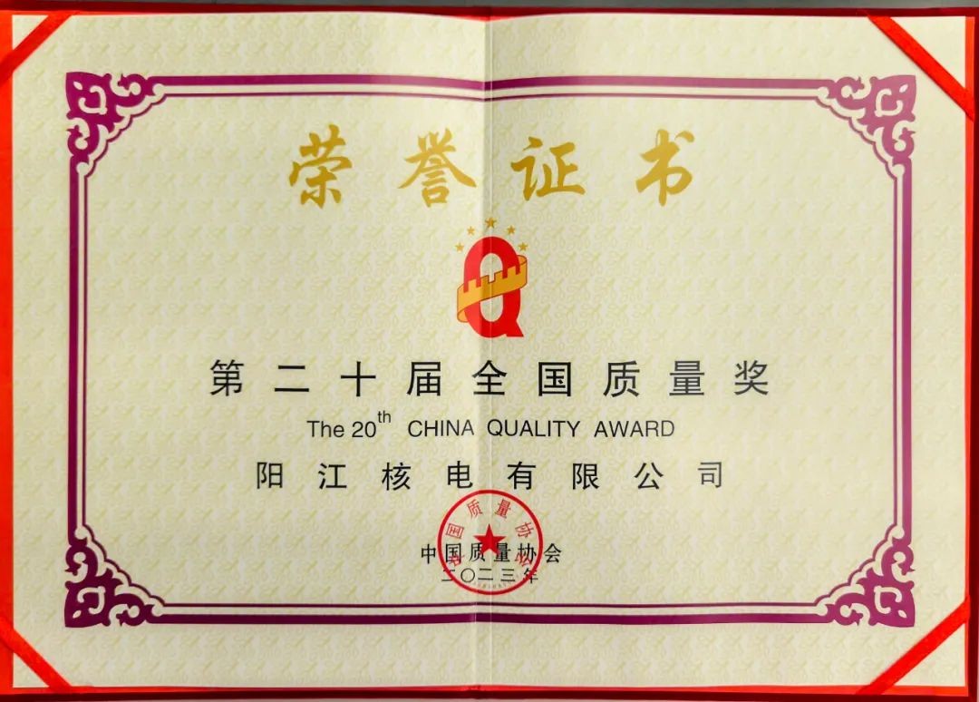 12月1日,第二十屆全國質量獎(2022-2023年)獲獎名單公布。陽江核電有限公司以其卓越的經營績效水平、顯著的文化凝聚力和質量管理方面的突出表現,榮獲第二十屆全國質量獎,這是繼大亞灣核電運營管理有限責任公司(第十六屆全國質量獎)、遼寧紅沿河核電有限公司(第十九屆全國質量獎)之后,中國廣核集團第三家獲得此獎項的單位。