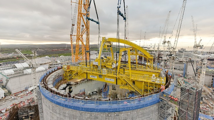 這臺(tái)重 750 噸的極地起重機(jī)已被吊裝到欣克利角 C 核電站的第一座反應(yīng)堆大樓上就位,該核電站由 EDF 在英格蘭西南部建造。