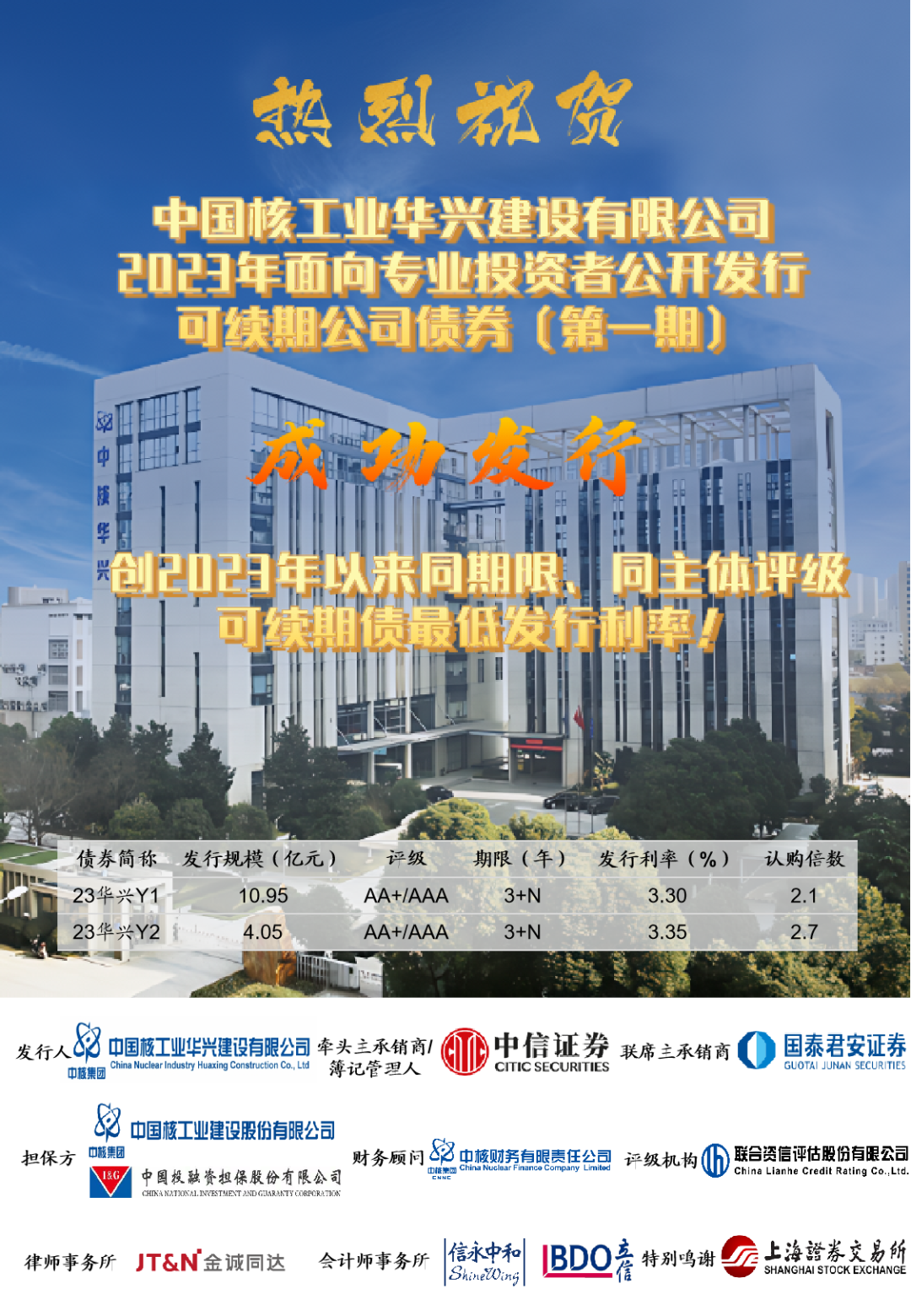 12月7日,中核華興成功于資本市場首次公開發行15億元可續期公司債,12月11日全部完成繳款。本期債券獲得理財、基金、證券等各類投資人踴躍認購,創2023年以來同期限、同主體評級可續期公司債最低發行利率,充分展現出投資人對中核華興“建筑業全產業鏈資源整合者和一體化解決方案服務商”“全球核電建造領跑者”品牌的認可,將進一步拓展公司融資渠道、夯實公司資本實力,助力公司業務結構調整和“十四五”戰略目標實現。