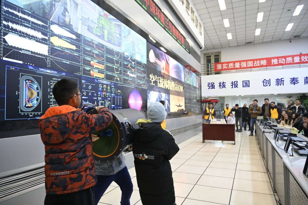 自新一代人造太陽“中國環流三號”面向全球開放后,12月17日,“太陽”現場迎來了第一波特殊客人。太陽團隊邀請家人們歡聚在實驗現場,參加2023年聚變科學所科普開放日活動,一同探秘人造太陽。大朋友和小朋友們積極參加互動,學習聚變科學知識,聆聽成績背后的故事,表示自己也可以加入傳播科學的隊伍,和親人們一起講好人造太陽的故事。
