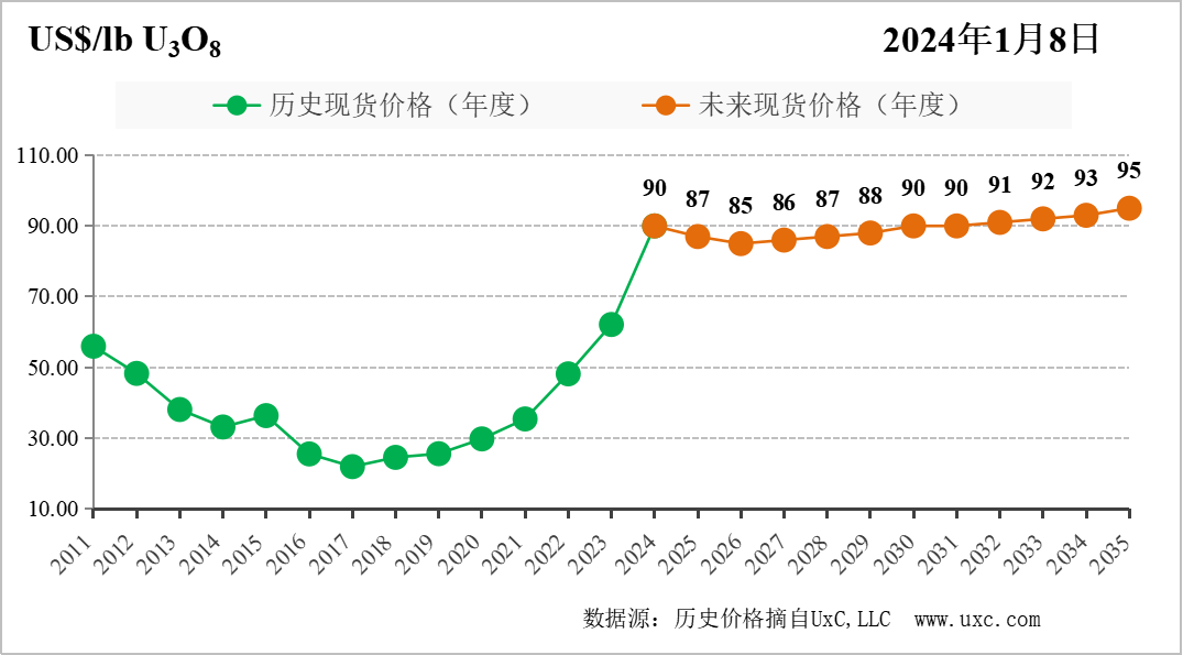 2024年1月8日,中國核能行業(yè)協(xié)會發(fā)布第38期“CNEA國際天然鈾價格預測指數(shù)(2024年1月)”。