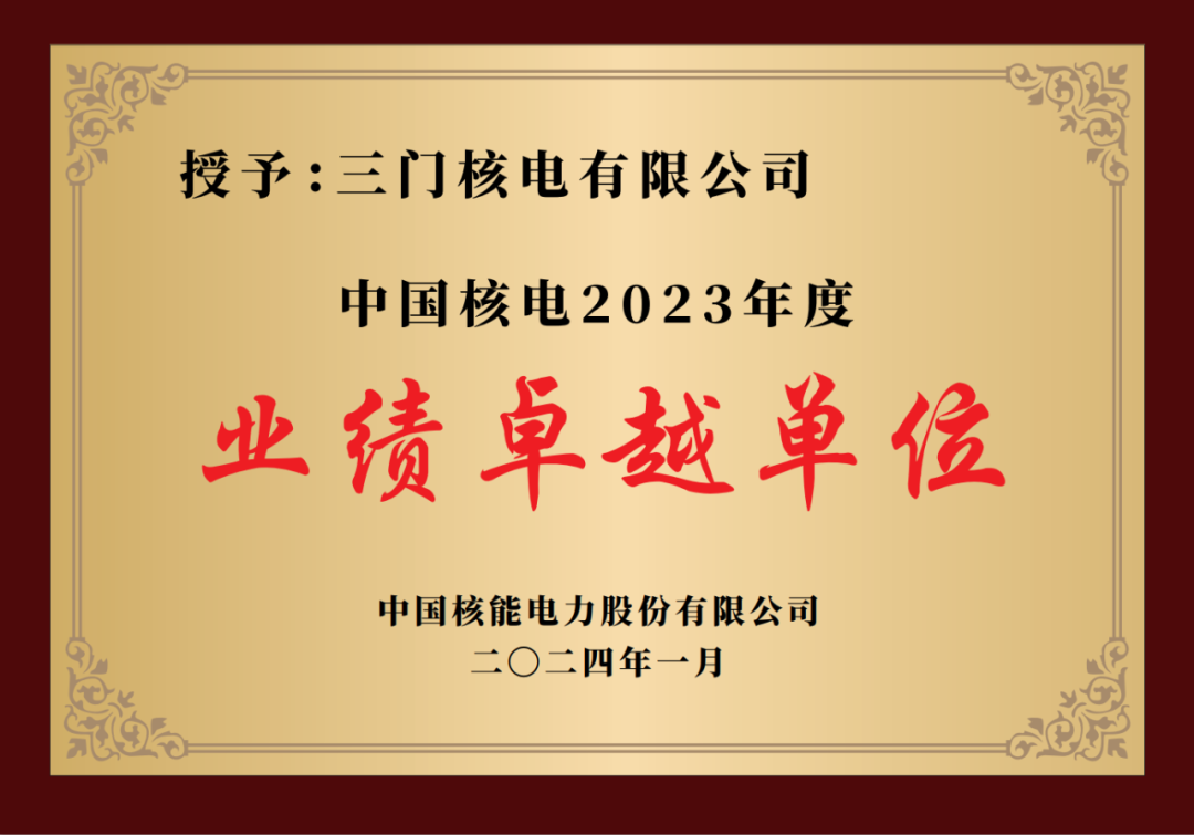 1月27日,在中國核電2024年度工作會議上,三門核電有限公司榮獲中國核電2023年度“業績卓越單位”榮譽稱號。這是公司2018年商運以來第三次榮獲該獎項,代表了中國核電對三門核電高質量發展業績的充分肯定。