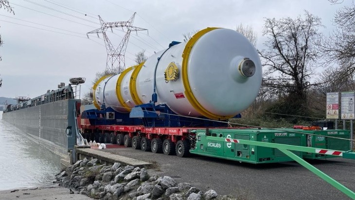 三臺新蒸汽發(fā)生器——每臺高約 21 米,直徑 4.5 米,重約 330 噸——經(jīng)過兩天的運(yùn)輸,于 1 月 11 日、18 日和 24 日運(yùn)抵 Cruas-Meysse 現(xiàn)場。這些組件由法馬通在索恩河畔沙隆的圣馬塞爾工廠制造,然后通過駁船運(yùn)輸 283 公里,通過公路運(yùn)輸 3 公里。這次旅程從去年六月就開始精心準(zhǔn)備。
