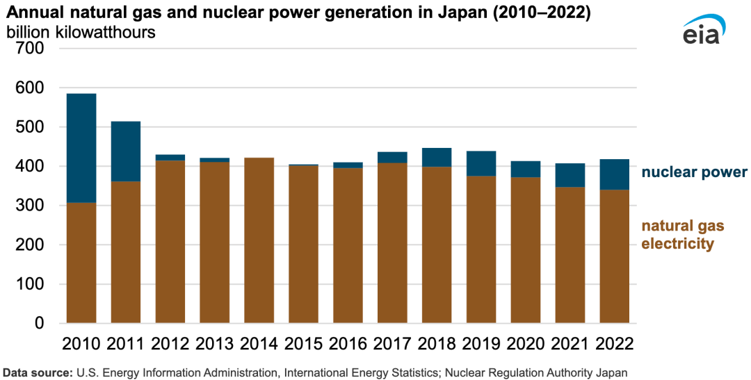 據美國能源信息署報道,2011年福島第一核電站事故發生后,日本暫停了剩余48座核反應堆的運行,幾乎完全依靠進口天然氣來彌補發電量的損失。2015年,日本允許其第一座核反應堆恢復運行。截至2022年12月,日本已有11吉瓦的核電裝機恢復使用,這減少了用于發電的液化天然氣進口。