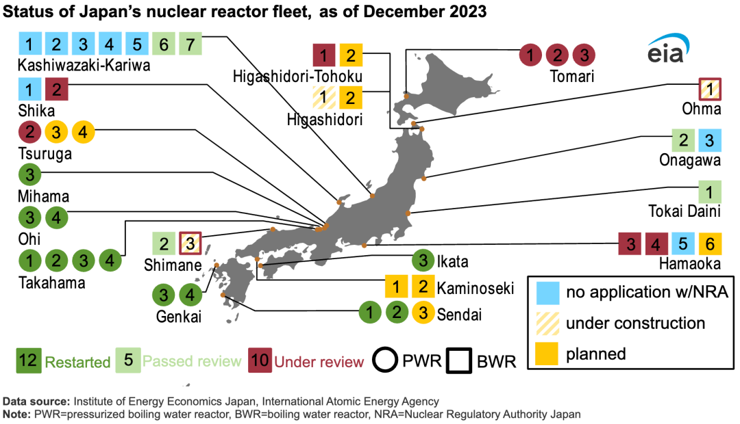 自2015年以來,核重啟一直進展緩慢。日本已經重啟了12臺機組,使目前的核運行能力達到11吉瓦。日本還有10臺正在審查中,還有5臺已經通過審查但尚未重啟。出于公共安全考慮,日本專注于重啟加壓沸水反應堆(PWR),而不是沸水反應堆(BWR)。六個機組的福島第一核電站是一個沸水反應堆設施,正在與其姊妹核電站福島第一核電廠一起退役。