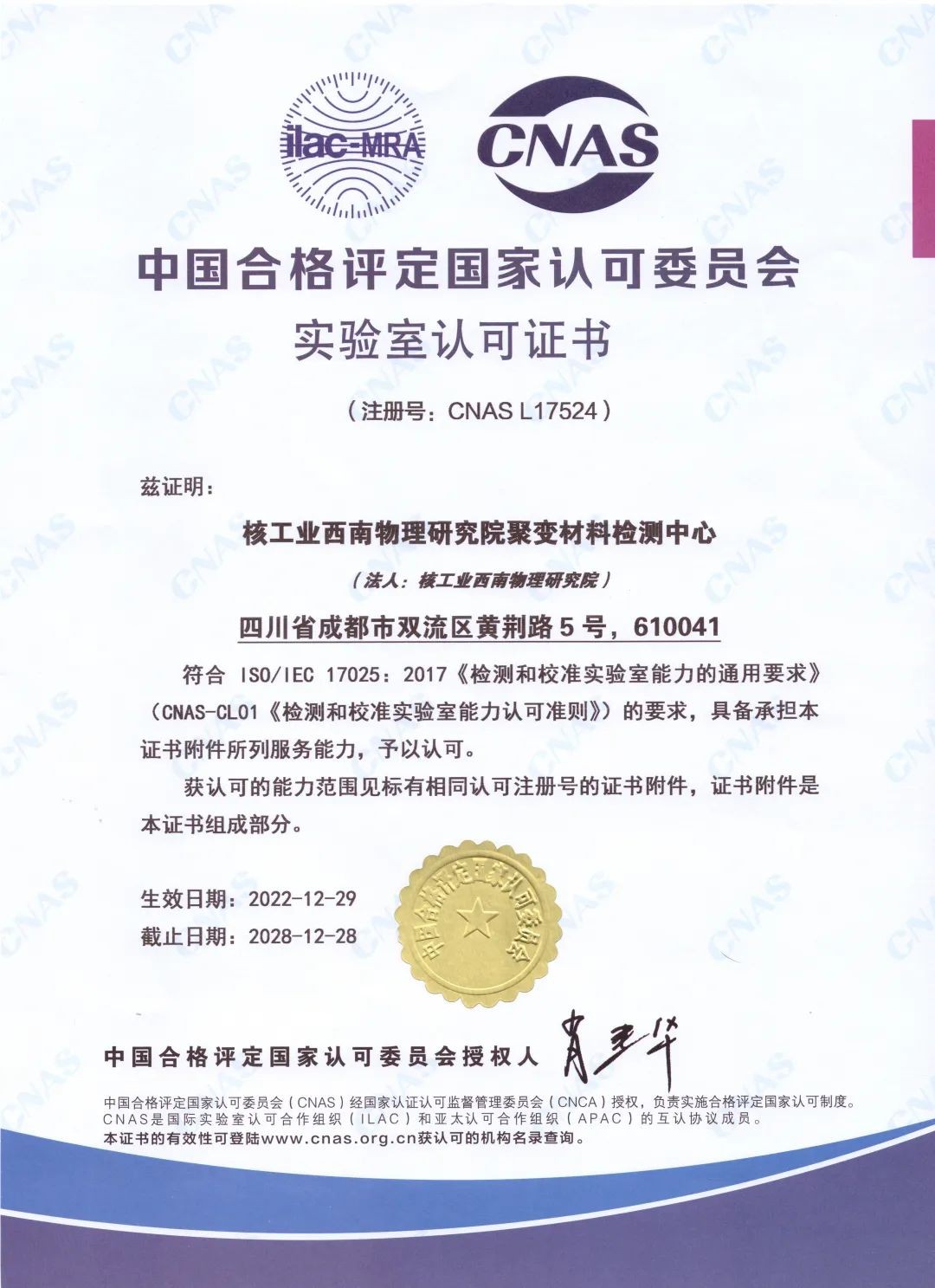 近期,核工業(yè)西南物理研究院聚變材料檢測中心(以下簡稱“檢測中心”)順利通過中國合格評定國家認(rèn)可委員會(CNAS)定期監(jiān)督現(xiàn)場評審,并于2024年2月27日獲批繼續(xù)持有CNAS實(shí)驗(yàn)室認(rèn)可證書資格。
