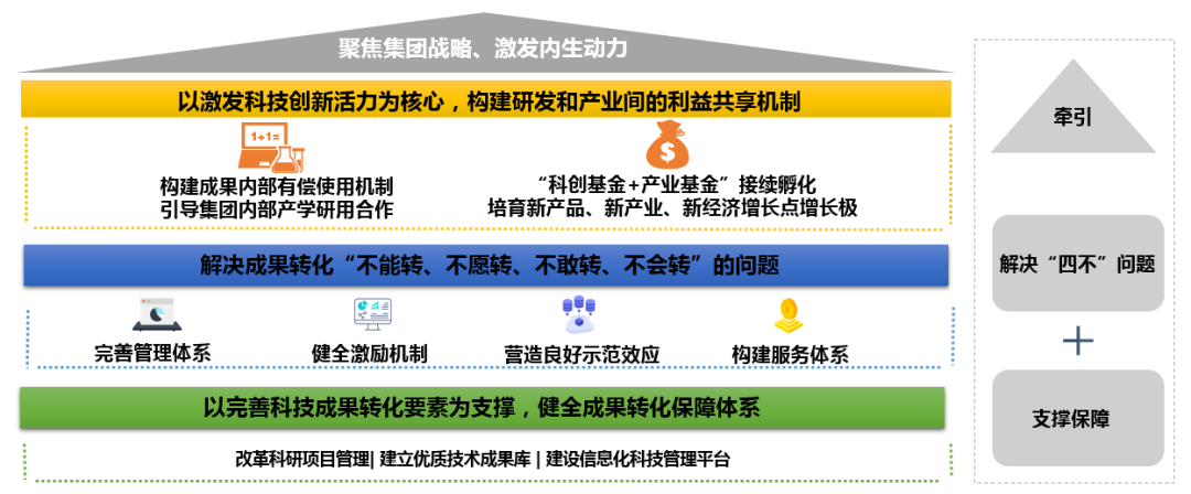 中核集團內驅型科技成果轉化生態系統集政策體系、服務平臺、科技成果、金融資本于一體,促進創新鏈、產業鏈、資本鏈、政策鏈的“四鏈聯動”,實現科技同經濟、創新成果同產業、創新項目同現實生產力、研發人員創新勞動同其利益收入“四個對接”,在集團內部構建符合科技創新規律、技術轉移規律和產業發展規律的產研協同創新機制,全面提升科研院所科技供給與轉移擴散能力,推動科技成果加快轉化為產業發展的現實動力。
