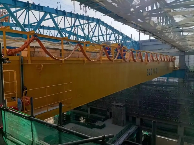 常規(guī)島主行車(chē)由兩臺(tái)最大承載320T的同軌道行車(chē)組成,具備聯(lián)鎖并車(chē)功能,是坐落在常規(guī)島A-B軸的“大力士”,承擔(dān)著工程建設(shè)階段汽輪機(jī)安裝扣蓋、發(fā)電機(jī)穿轉(zhuǎn)子等重要安裝工作以及后期設(shè)備運(yùn)維吊運(yùn)工作,與太平嶺核電2號(hào)機(jī)冷試節(jié)點(diǎn)常規(guī)島安裝主線緊密相關(guān)。