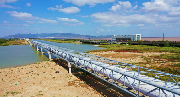 連云港石化產業基地綠色供能工程位于江蘇省連云港市,主要建設田灣核電站至連云港石化產業基地長約19.46千米的蒸汽管道,單根蒸汽管道設計輸送蒸汽規模為300噸/小時。該項目跨越1處海域、9條河流、22條道路,共架設跨越桁架長度約2560米。項目建成后,每年可減少燃用標準煤40萬噸,相應減排二氧化硫184噸、氮氧化物263噸、二氧化碳107萬噸。