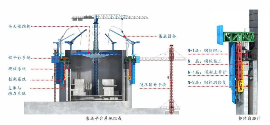 核島施工平臺是基于超高層住宅建筑的“住宅造樓機”和摩天大樓的“空中造樓機”技術而研發(fā)的核電反應堆廠房專屬施工技術。該技術通過內外殼等高同步施工立面流水作業(yè)設備設施集成等方式提升施工工效縮短施工周期、降低安全風險。同時它還具有整體自爬升、多層作業(yè)面服務全階段、設備設施集成、安全監(jiān)控保障等顯著特征。