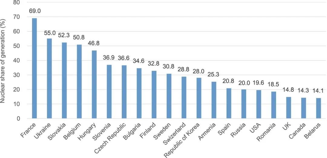 圖1 核電占比超過本國電力供給1/5的國家(2021年12月)。