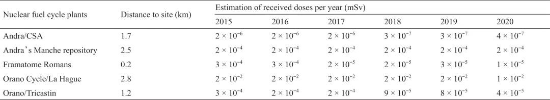 表1顯示了正常運行期間法國核燃料循環設施的輻射影響。據估算,輻射劑量仍然很低,比天然輻射照射的年劑量低2~4個數量級。