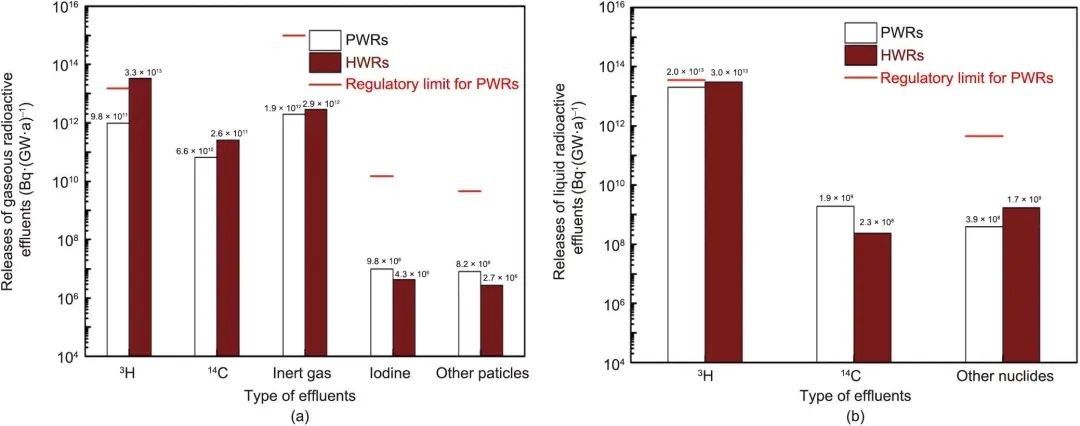 一般來說,根據法國核電站在正常運行期間的實際放射性排放量估計的劑量比前面提到的天然放射性劑量水平低三個數量級以上。通過監測中國6座壓水堆核電站(PWR)和一座重水堆核電站(HWR)運行期間的氣體和液體流出物,發現其排放量遠低于監管限值和天然輻射照射水平。多年來,中國和法國的液體和氣體放射性排放量都大幅減少。
