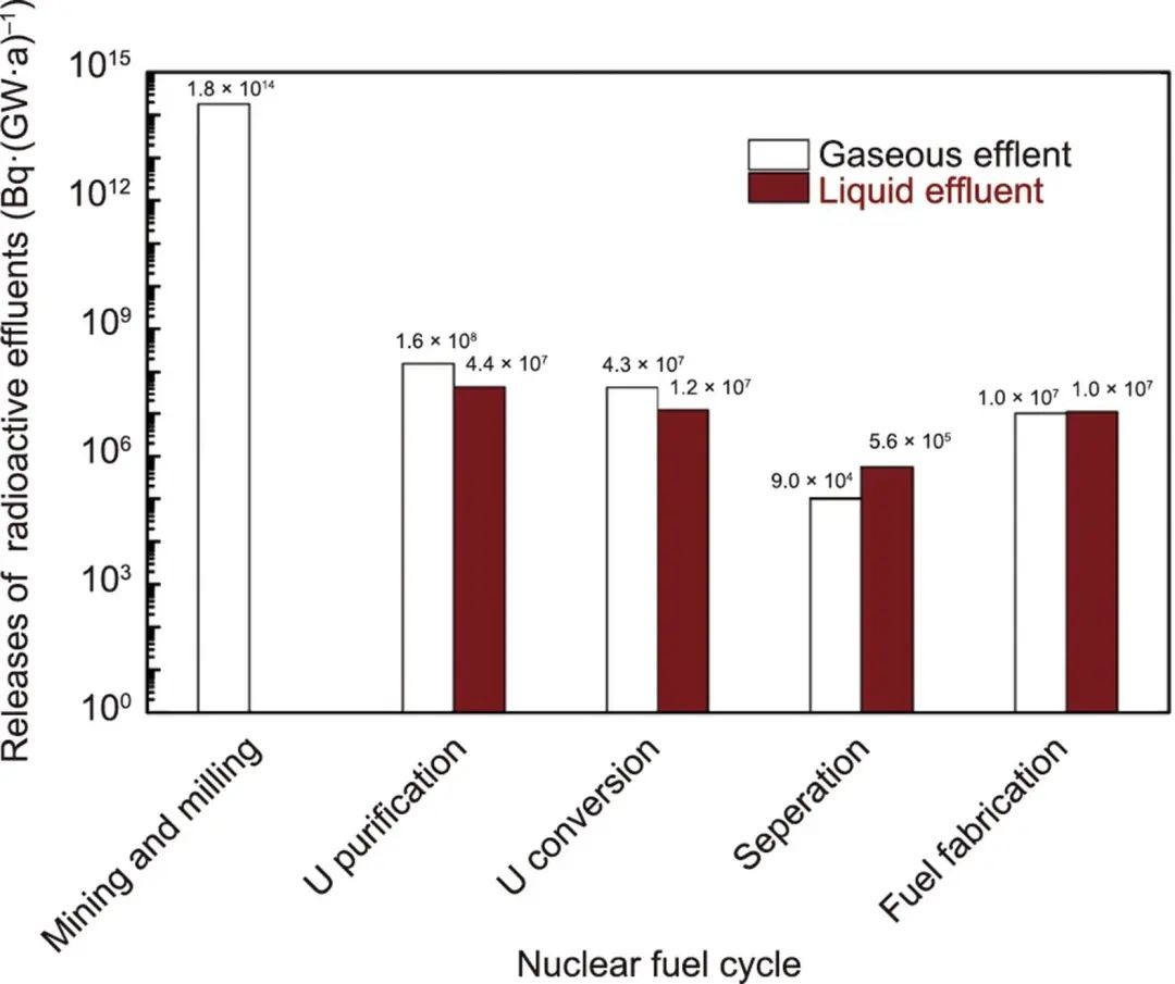 圖3 中國核燃料循環放射性流出物的平均排放量(2011—2013)。經許可轉載自參考文獻。U:鈾。