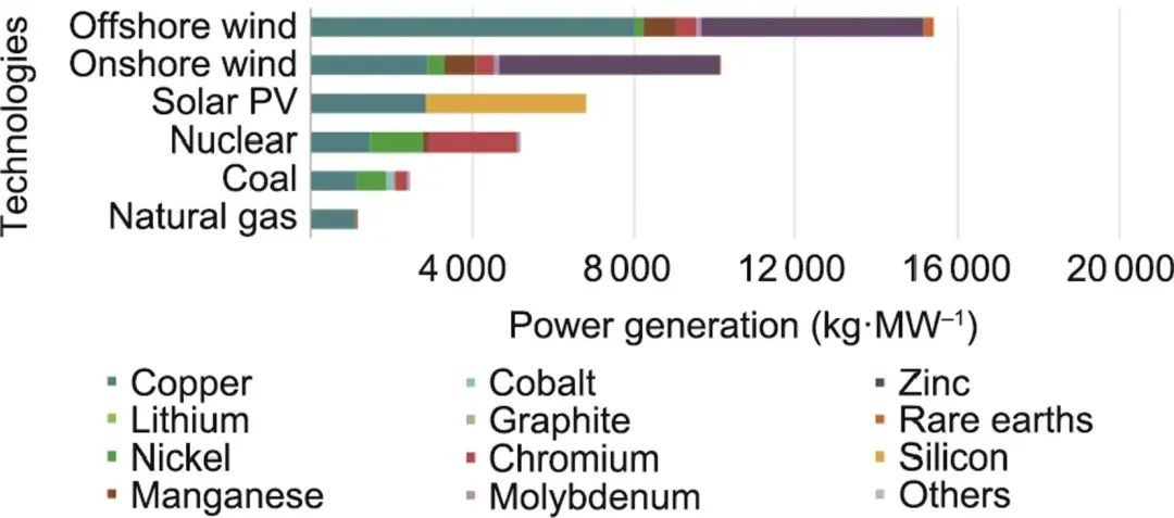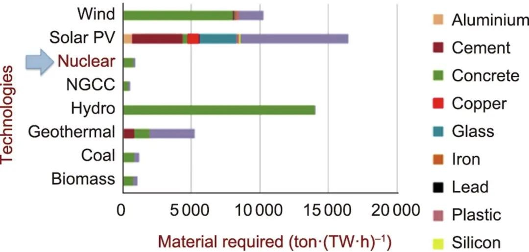 圖5 不同發電技術所需的材料量(不包括燃料),以單位裝機容量(MW)所需的材料質量表示。經許可轉載自參考文獻。