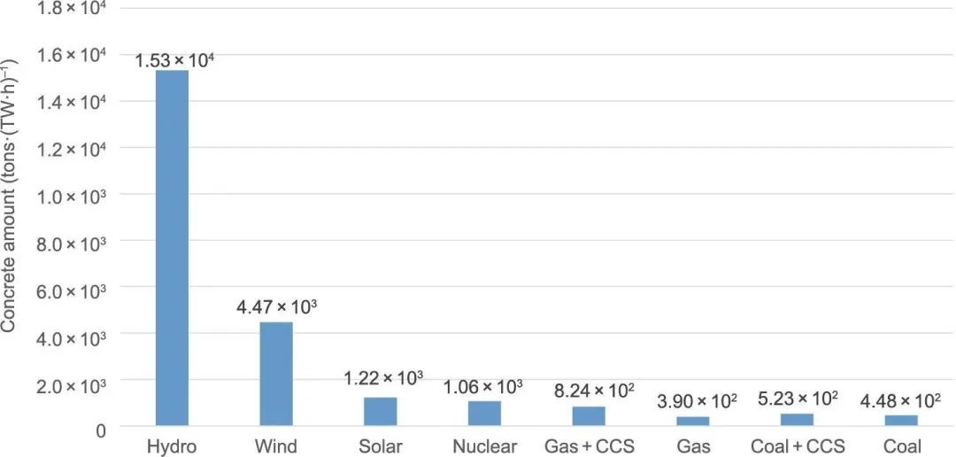 圖7 從全生命周期分析中推斷的各種發電形式所需混凝土量[t?(TW·h)-1]。經許可轉載自參考文獻。