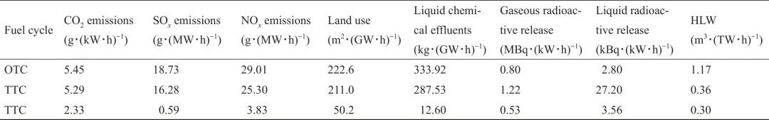 如果采用四代快中子反應堆發電,如鈉冷快堆(SFR),由于取消了所有的前端循環操作,廢物釋放量和生成量將大幅減少。達到平衡狀態的SFR可以使用自身產生的乏燃料和額外的貧鈾運行,并有可能燃燒次錒系元素。理論上講,钚和鈾的多次回收以及次錒系元素嬗變需要附加的乏燃料后處理步驟,可將HLW危害的持續時間從幾十萬年縮短至幾百年。在法國,已經通過千克單位的小規模試點證明了提取次錒系元素的可行性。但只有當四代快中子反應堆趨于成熟后,才可能被擴大到工業規模。研究表明,只有當所有SFR都能嬗變錒系元素時,才有可能發生次錒系元素的嬗變。快中子反應堆基本上可燃燒貧化鈾,從而繞過燃料循環的前端(特別是鈾礦開采),進一步減少核能系統的環境足跡。根據法國核設施基地的全生命周期分析,表3進行了不同方案的比較。