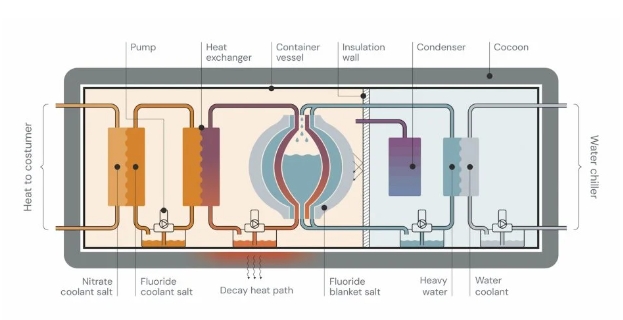 哥本哈根原子能公司正在開發(fā)的技術(shù)是重水慢化釷熔鹽反應(yīng)堆,該反應(yīng)堆安裝在一個(gè) 40 英尺的容器內(nèi),其制造方式與當(dāng)今的汽車生產(chǎn)方式類似。該公司計(jì)劃在裝配線上大規(guī)模生產(chǎn)反應(yīng)堆,每條裝配線每天可生產(chǎn)一座反應(yīng)堆。