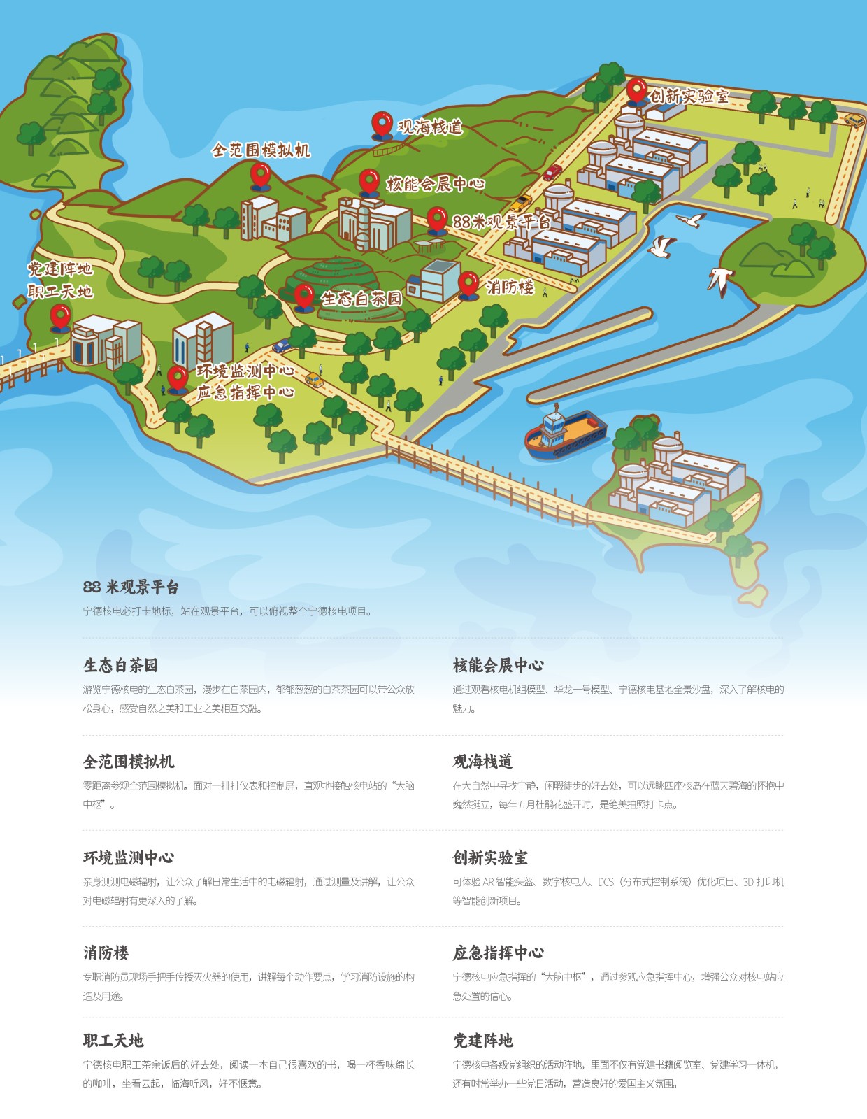 本屆“8·7公眾開放體驗日”活動現場,《中廣核核電工業旅游白皮書》正式發布,這是全國核電行業首份工業旅游白皮書。白皮書不僅包含了中廣核九大核電基地的工業旅游路線圖,而且整合了核電基地周邊富有特色的旅游景點,通過手繪地圖結合文字介紹的形式,為公眾提供了一站式核電工業旅游指南,這些兼具趣味性、實用性的地圖也同步在“核電工業旅游預約系統”中展示,為公眾提供更便捷的指引。
