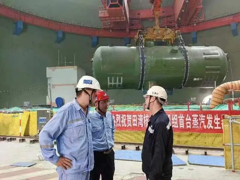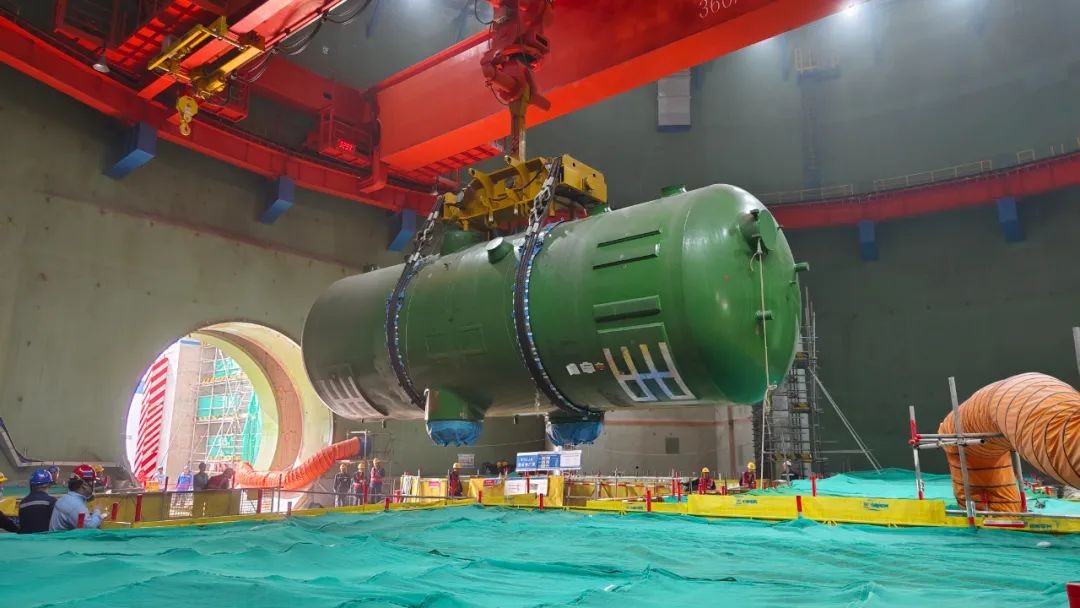 2024年8月11日上午9時,田灣核電站8號機組首臺蒸汽發生器順利起吊,經過吊具連接、試吊、起鉤回轉、調整角度等操作后,于10時40分準確就位至2環蒸汽發生器支承托架上,標志著8號機組首臺蒸汽發生器吊裝就位里程碑節點順利完成。
