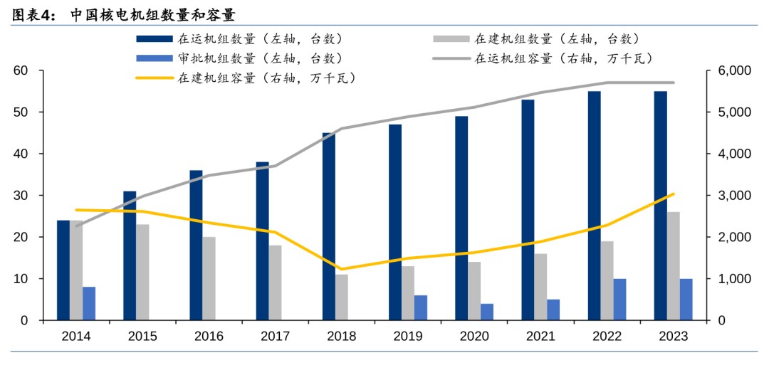 核電發(fā)電穩(wěn)定/碳排放低,安全為發(fā)展前提,常態(tài)化審批漸進。核電站發(fā)電原理是利用鈾核裂變所釋放出的熱能驅(qū)動汽輪機做功,具備能量密度高、功率大、發(fā)電穩(wěn)定且成本低的特點,其年平均發(fā)電小時數(shù)是中國發(fā)電設(shè)備發(fā)電小時數(shù)平均值的2倍。安全是核電行業(yè)發(fā)展的前提,自日本福島核事故以來,我國核電審批一度停滯,2016-2018連續(xù)3年沒有新增審批核電機組。直到2019年中國重啟核電審批,隨后三年每年核準機組數(shù)量穩(wěn)定在4-5臺,“十四五”規(guī)劃中明確提出安全穩(wěn)妥推動沿海核電建設(shè)。2022年和2023年我國均核準10臺,較2021年數(shù)量翻倍,審批顯著提速,常態(tài)化審批漸行漸近。