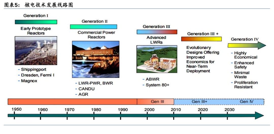 裂變核電技術(shù)已發(fā)展到第四代,安全/可持續(xù)性/經(jīng)濟性不斷提高:(1)第一代核電技術(shù):1950s-1960s期間,美蘇英法等國建造一代堆,主要是試驗性和原型反應(yīng)堆;(2)第二代核電技術(shù):1960s末期,和第一代反應(yīng)堆相比,裝機容量不斷增加,主要堆型有壓水堆、沸水堆、重水堆等;(3)第三代核電技術(shù):主要是先進輕水堆,包括先進壓水堆和先進沸水堆,其特點是采用非能動安全系統(tǒng)或先進的能動安全系統(tǒng)以提高安全性;(4)第四代核電技術(shù):由“第四代核能系統(tǒng)國際論壇”(GIF)提出的能夠解決核能經(jīng)濟性、安全性、廢物處理和防核擴散問題的第四代核電核能系統(tǒng),包括鈉冷快堆、高溫氣冷堆、氣冷快堆、鉛冷快堆、超臨界水堆和熔鹽堆。