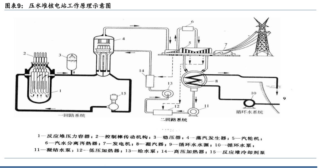 第二代核電在第一代核電的基礎(chǔ)上實現(xiàn)了商業(yè)化應(yīng)用,按照冷卻劑的不同,可分為輕水堆和重水堆,其中輕水堆按照工作原理不同分為壓水堆和沸水堆。在核燃料上,由于冷卻劑中子吸收概率的不同,壓水堆和沸水堆使用高富集鈾,而重水堆使用天然鈾。在回路系統(tǒng)上,壓水堆和重水堆均采用二回路系統(tǒng),回路系統(tǒng)相似,包括反應(yīng)堆容器、冷卻劑泵、穩(wěn)壓器、蒸汽發(fā)生器、汽輪機、汽水分離再熱器、凝汽器、凝結(jié)水泵、給水加熱器、除氧器、疏水泵、給水泵等,其主要差別體現(xiàn)在反應(yīng)堆結(jié)構(gòu)上;而沸水堆采用一回路系統(tǒng),省去了蒸汽發(fā)生器和穩(wěn)壓器,增加了汽水分離器、蒸汽干燥器、噴射泵和再循環(huán)泵,這使得沸水堆在運行過程中放射性物質(zhì)泄露的風(fēng)險更大。